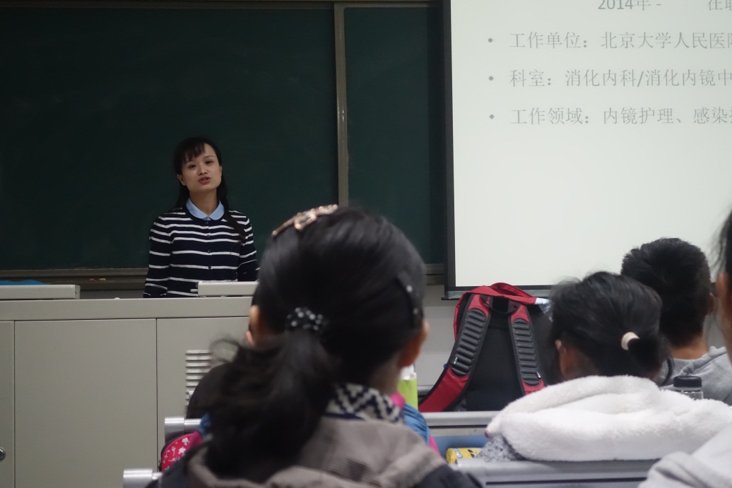 第二位进行讲座的是05届学姐华小雪,小雪学姐一直都在急诊科做护士,经历过众多生离死别的场面,但是这并没有让她变得冷漠,反而令她看到了人性的温暖。她告诉同学们护理的工作是崇高的,因为我们通过自己的工作从死亡边缘拯救生命,并让其康复重生,这是有多么的神圣和伟大!在讲座过程中,小雪学姐不断提到学习的重要性。在大学四年过程中,静下心来,学习基础课程、学习护理,用精准的知识挽救病患的生命,而不是等真正到了实践,因为你的一个小小的疏忽或对病情的不了解而导致病患的病情加重甚至死亡。静心学习,以避免追悔莫及。学姐积极的心态也是令同学们印象深刻。面对错综复杂的关系,最重要的是看待事情的心态。生离死别的消极情感一定也会伴随感人的事情。即使时间让人淡漠了生死,但同时也会让人更珍惜人生。所以,淡然处事,宽心待人。